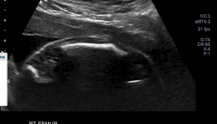 At each serial ultrasound appointment, the sonographer evaluated existing fractures during and looked for new breaks, particularly in the long bones. It is, therefore, so important to really zoom up the images so that the area of focus takes up 80-90% of the screen, as this can be extremely subtle. The sonographer would also monitor ribs to make sure they were structurally sound and growing properly, as pulmonary hypoplasia is a serious complication.