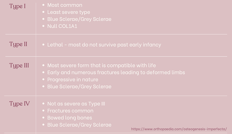 Type 1 is insufficient collagen due to a null gene mutation. Types 2-4 are caused by mutations affecting the collagen structure). These mutations can alter the size, length, helical pattern, folding, gene sequencing, and matrix organization of Type 1 collagen, which accounts for the wide spectrum of clinical features of OI.